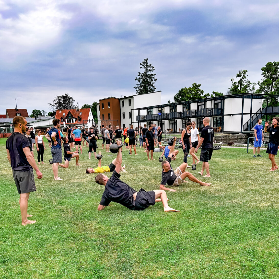 Kromě jednoho odpoledne, kdy nás vyhnal zesilující déšť do haly, se cvičilo venku, na slunci, na boso na trávě. Zatímco začátečnická skupina se zaměřila na základní cviky (mrtvý tah, pohárový dřep, swing, jednoruční swing, get-up), ve skupině pokročilejších byl navíc vyučován kettlebell Snatch a kettlebell Bent Press. Vzhledem k tomu, že se nejedná o technicky nejjednodušší cviky, plánem bylo propracovat se k nim postupně pomocí nejrůznějších drilů a progresí, což fungovalo perfektně.